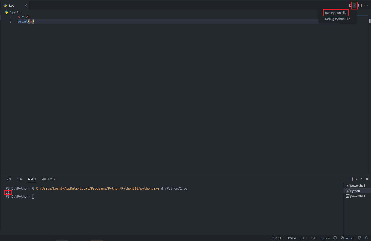 Run Python File 을 클릭하시면